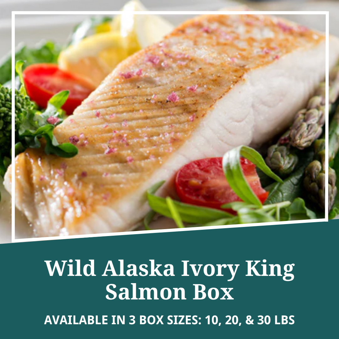Wild Alaska King Salmon Box Enjoy delicious Troll-Caught Wild Ivory King Salmon, harvested sustainably in Alaskan waters near Sitka, Alaska. Also known as white king, ivory king salmon is more densely oiled than regular king, resulting in a silky and buttery texture with a milder flavor than classic red king salmon. All of our seafood is flash frozen or "fresher than fresh" to ensure its quality is maintained at the peak of freshness.